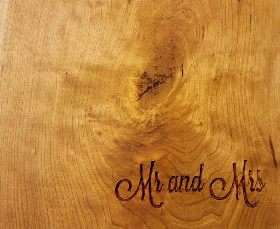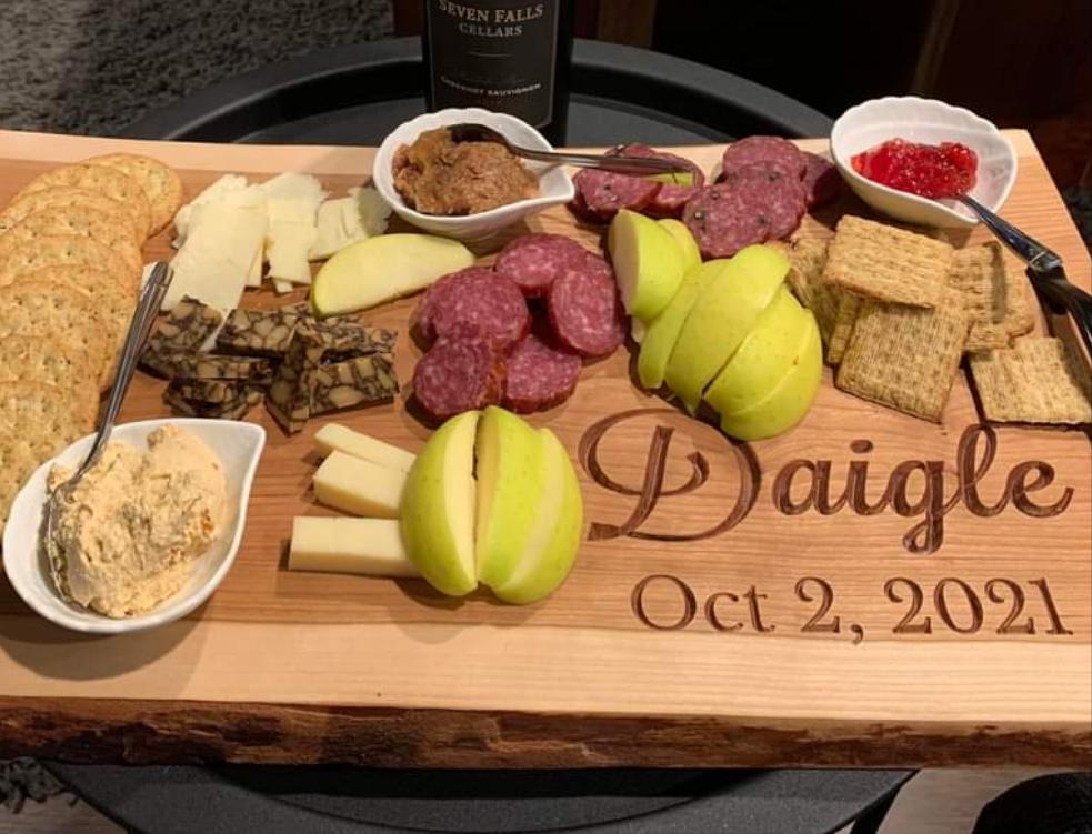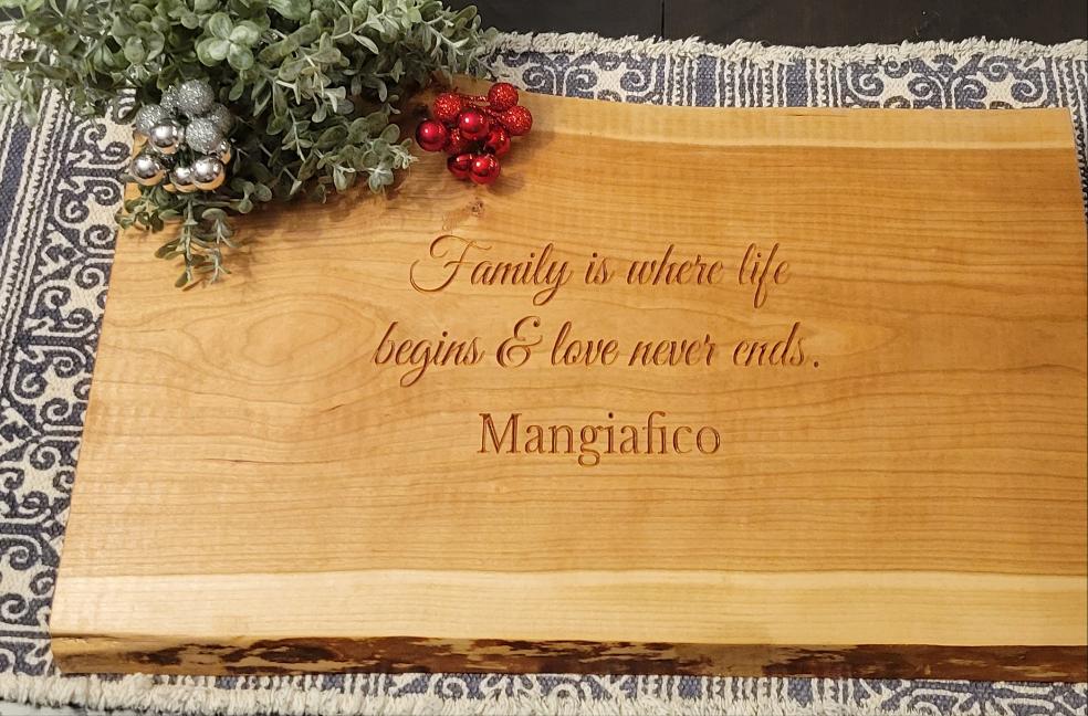 Give the gift of a custom live edge cherry engraved charcuterie board from Kendal Heights Decor and Woodworking!