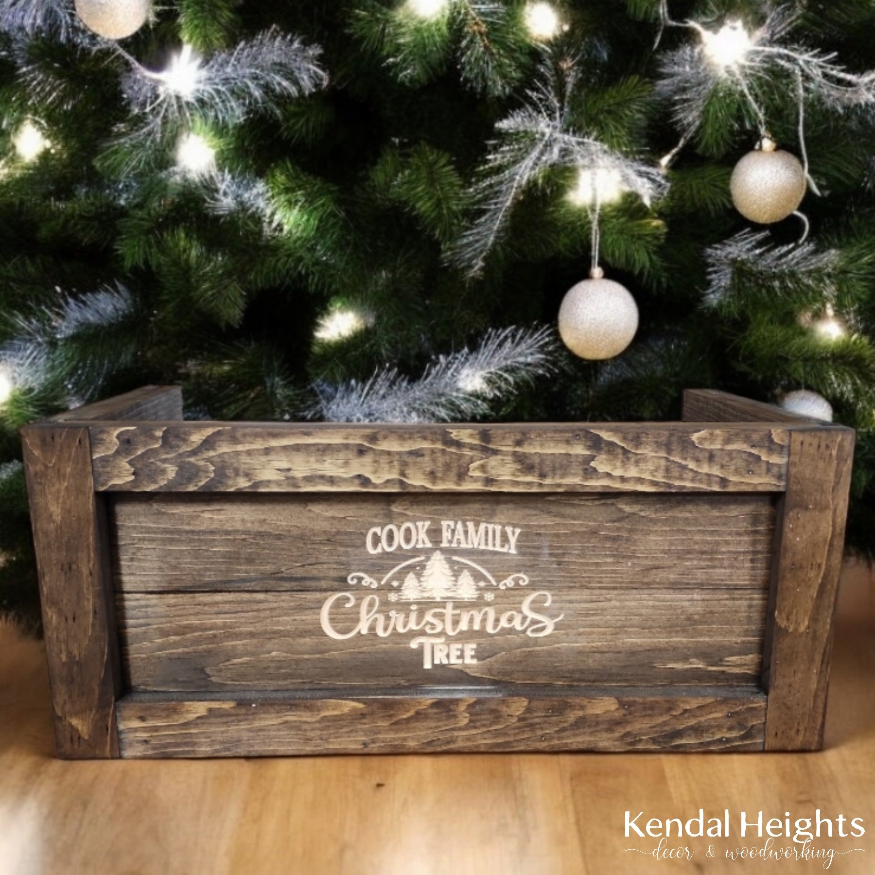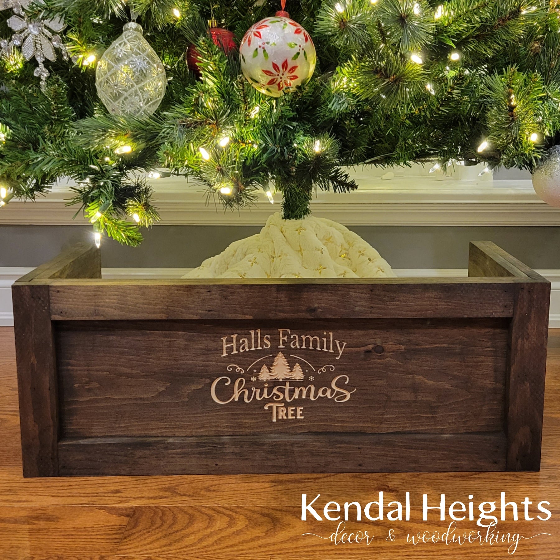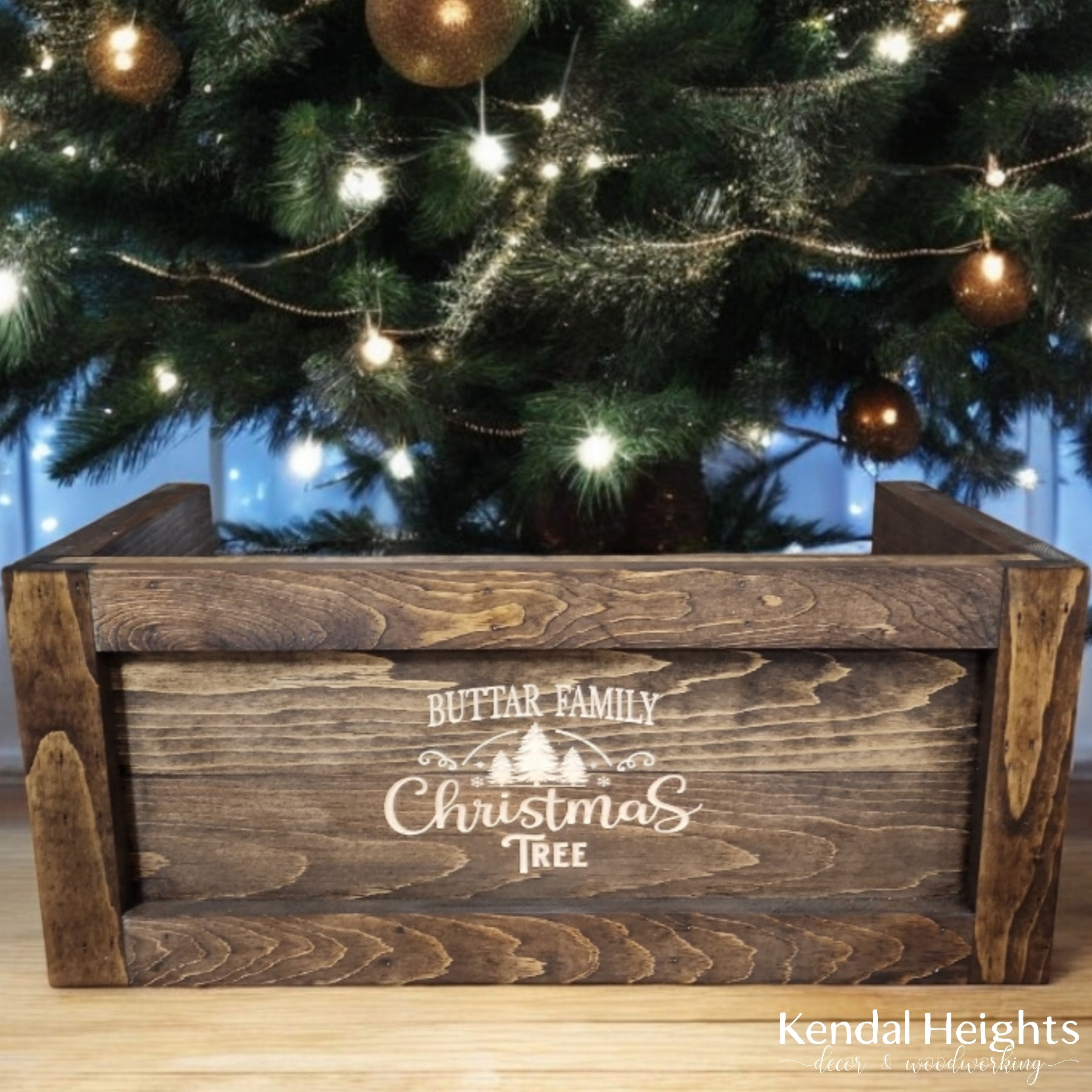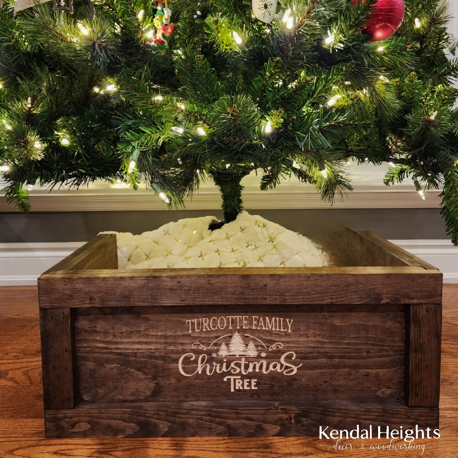 Measuring 25" wide x 12" deep to fit around the base of your tree.