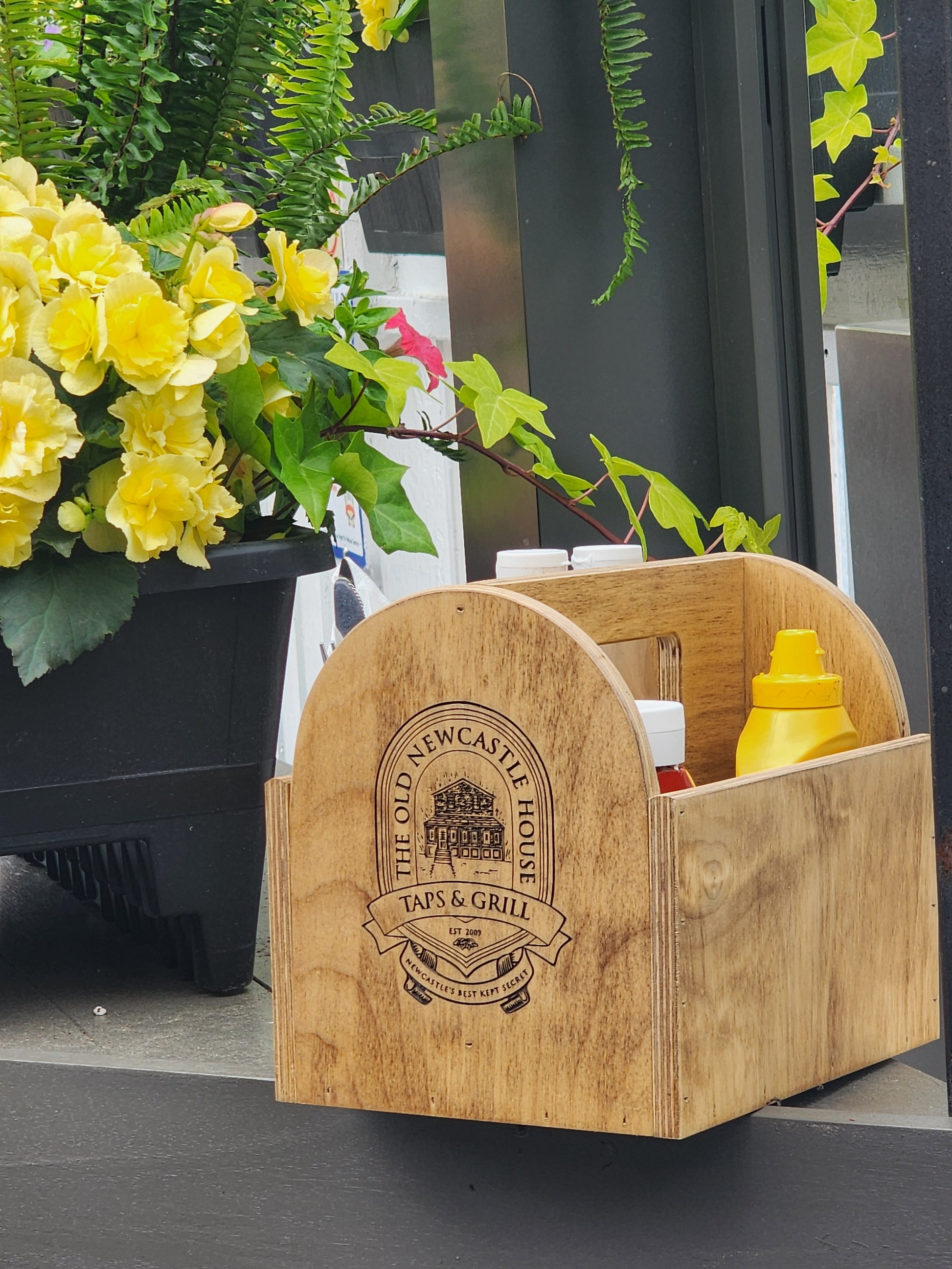 A must have for backyard entertaining. Hold your condiments or drinks in a custom caddy with laser etching.