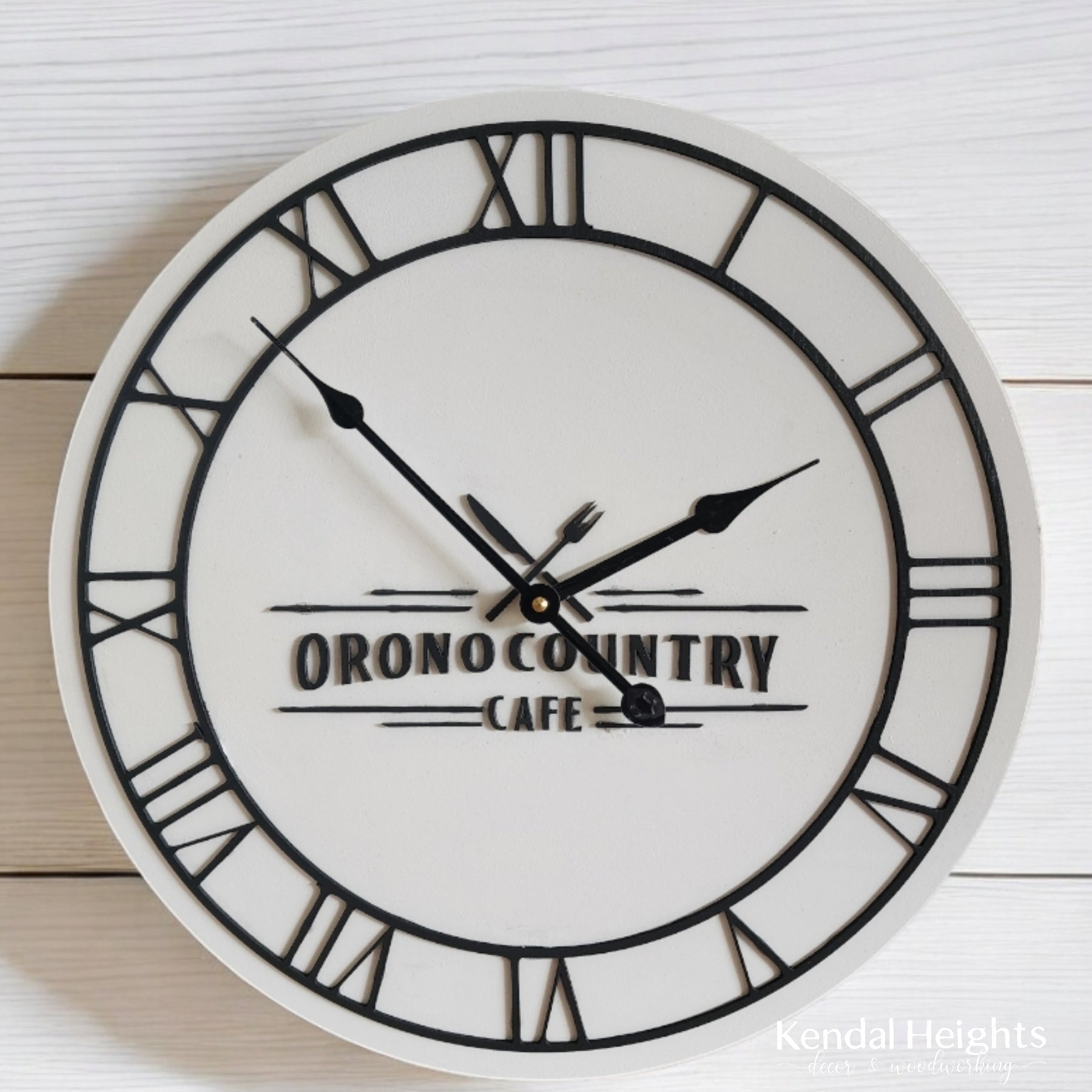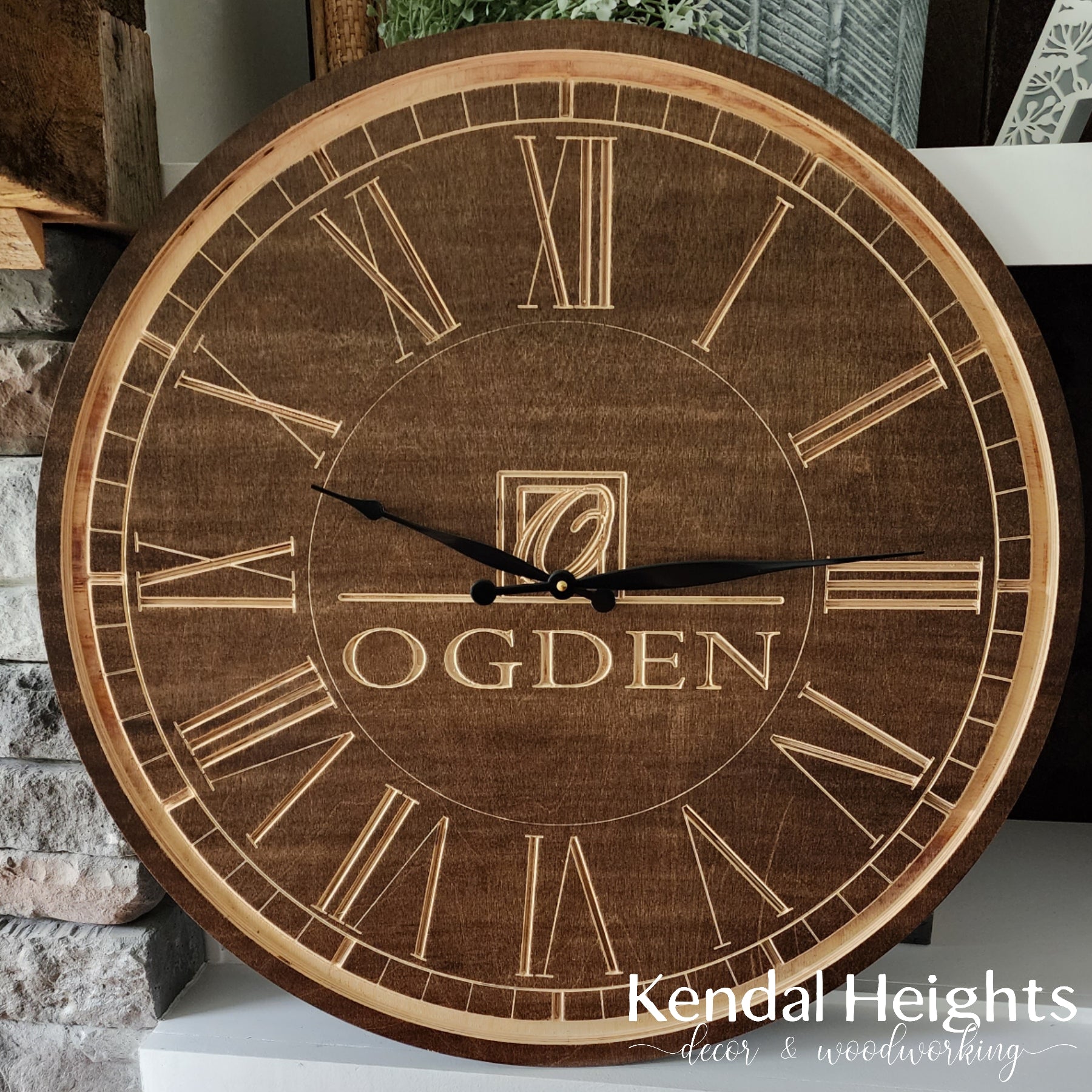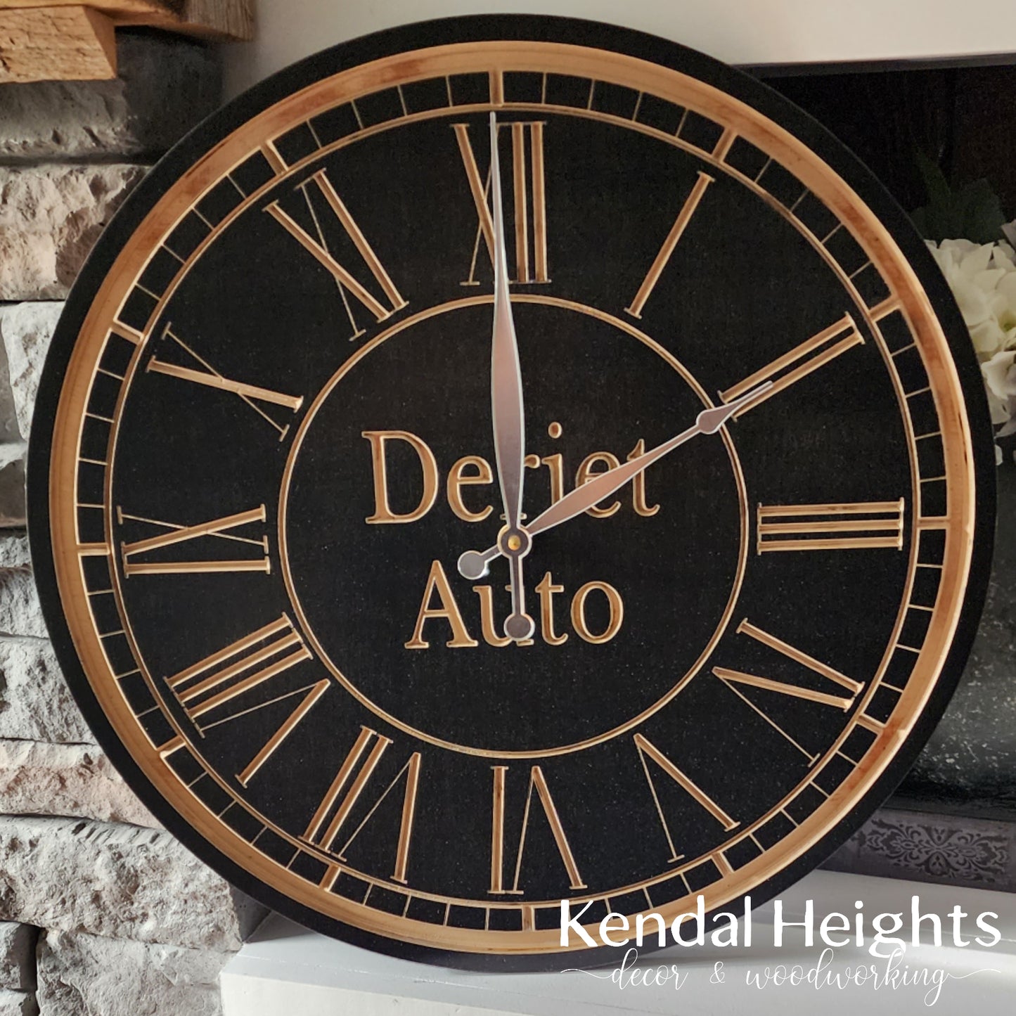 Stay in the present with a custom engraved wood clock from Kendal Heights Decor and Woodworking! You will receive a message from us with a mock-up of your custom design so you can approve it prior to engraving.