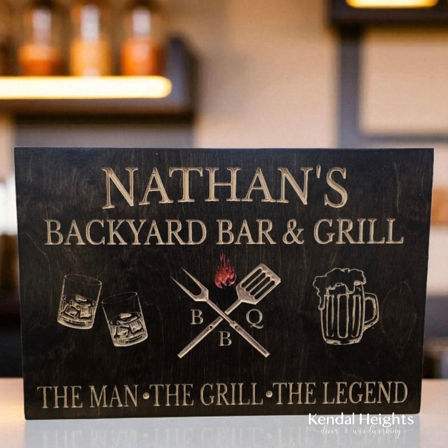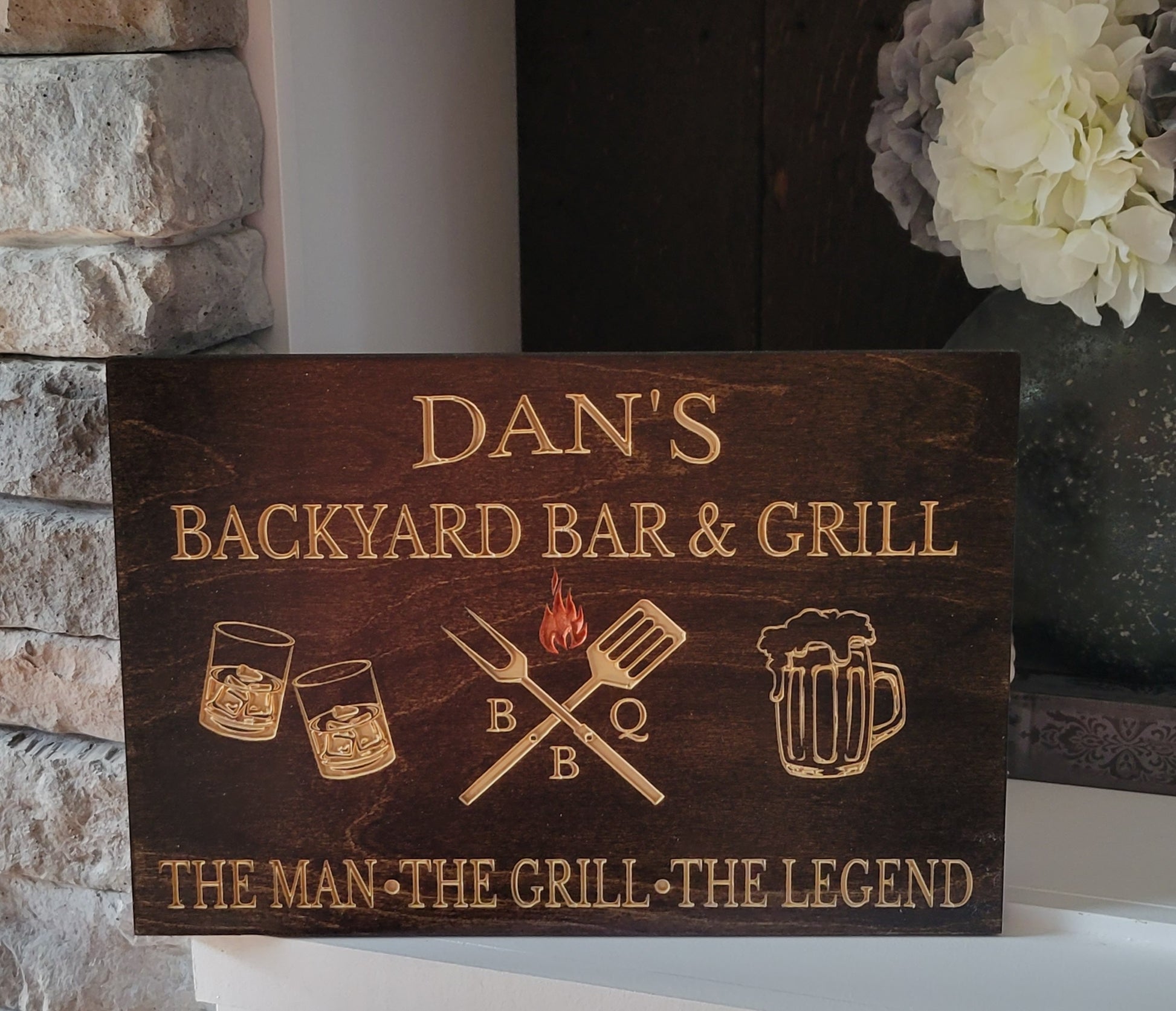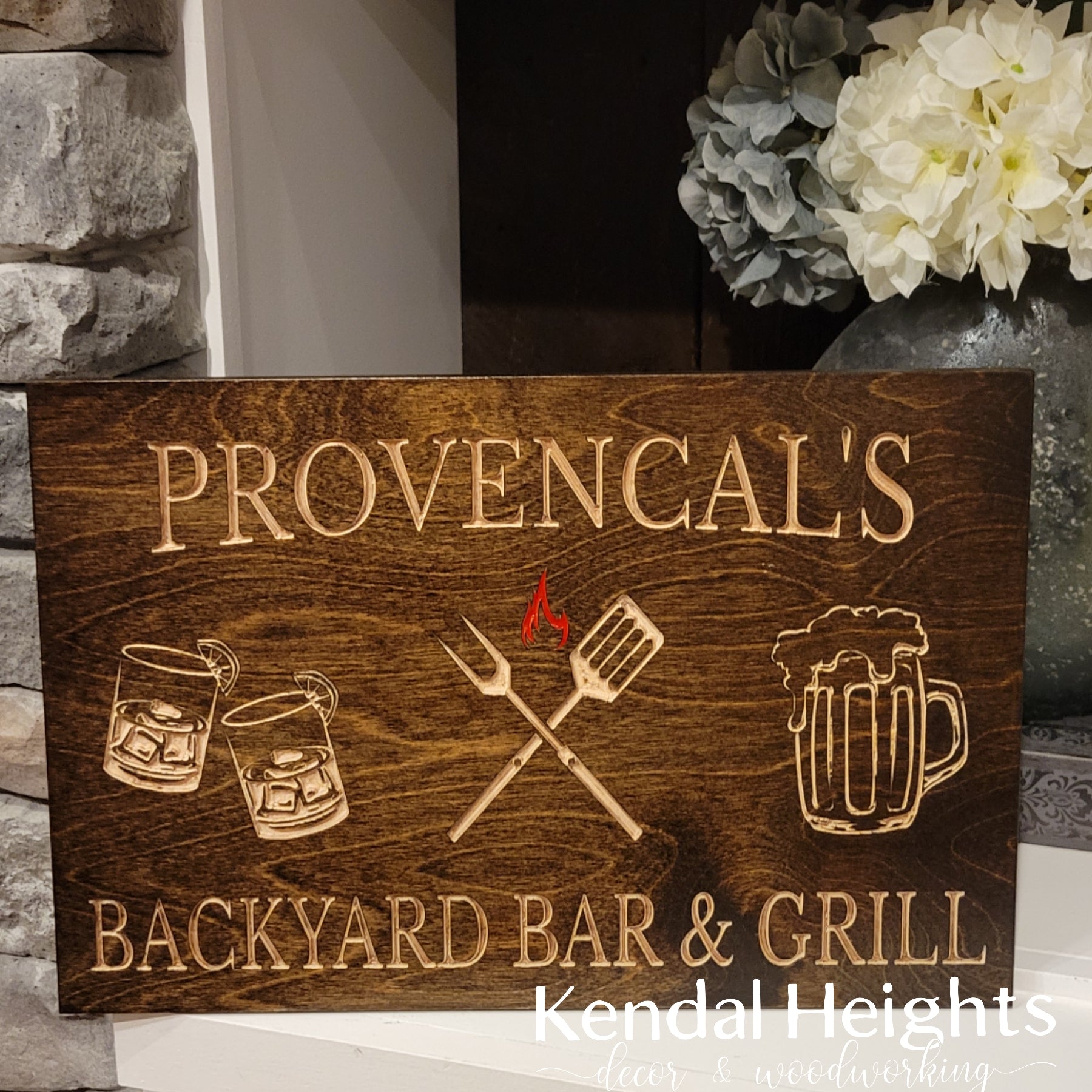 Give a custom engraved grilling sign for that finishing touch outside. Featured with grilling utensils, glasses and a beer.