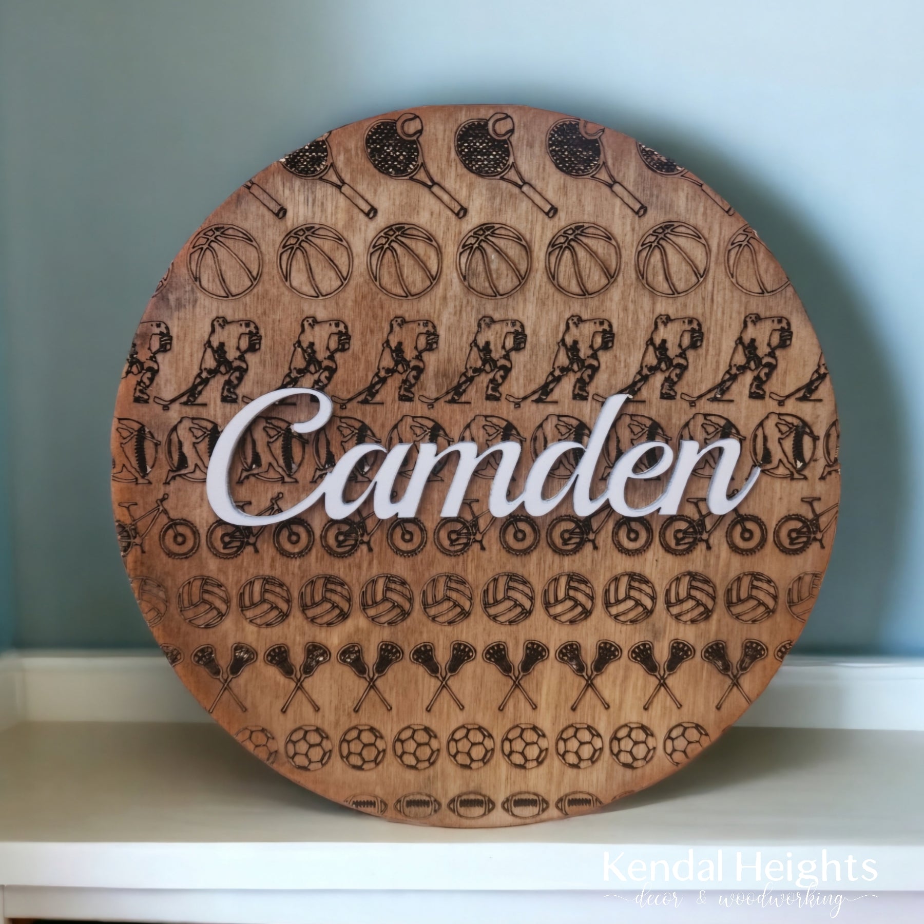 Featured in 15" round with etched backing and raised names.