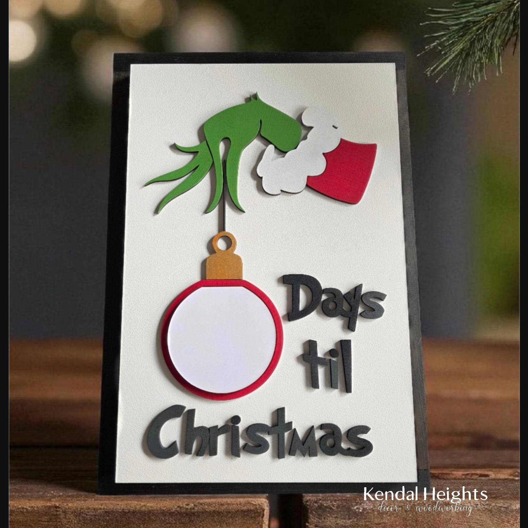 Raised Grinch on a white sign with frame. The cute ornament features a white board to change the date.