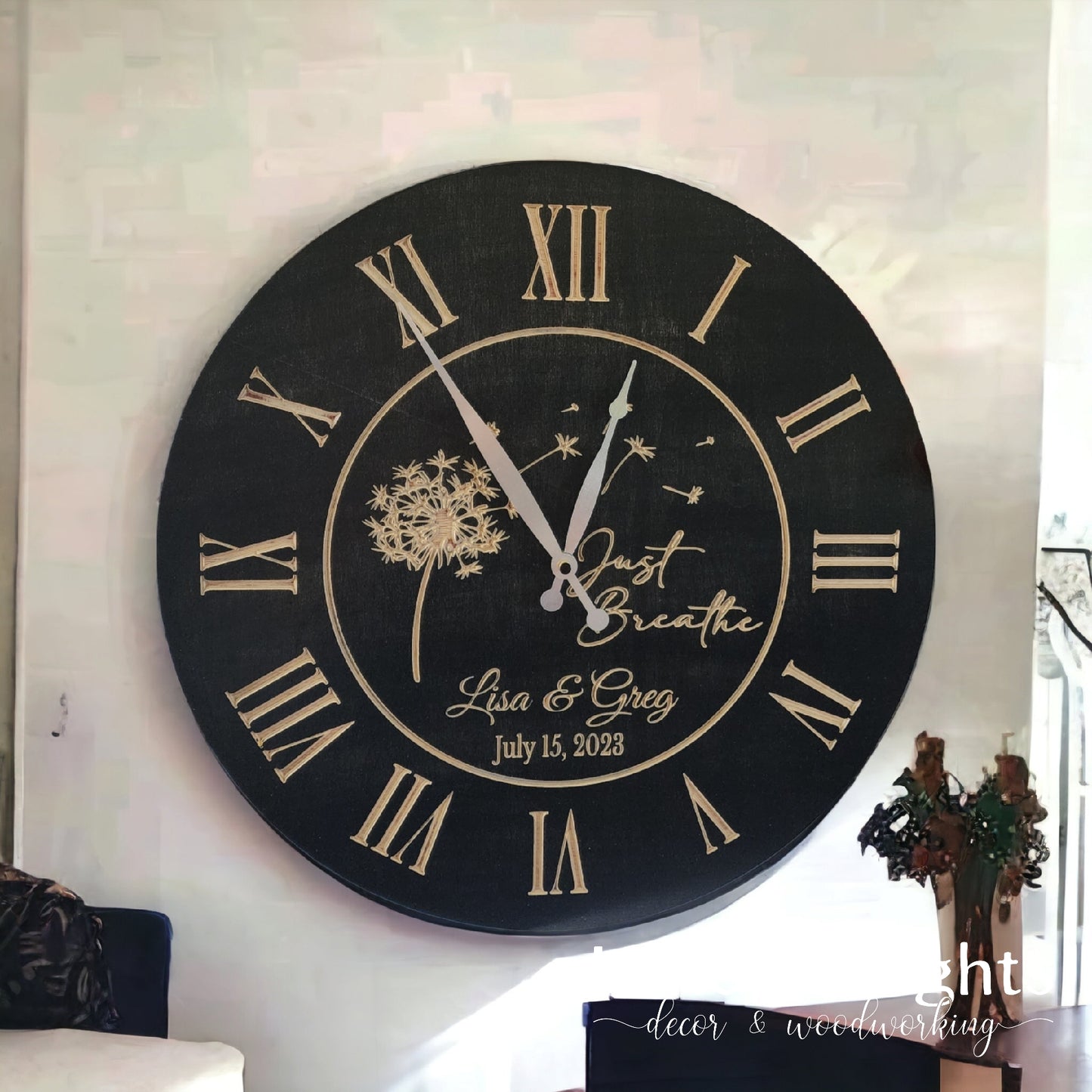 Custom engraved clock painted in a very pretty and soft Raw Silk or Black. Perfect for any home, cottage and farmhouse. Very popular and will make an amazing new home décor piece or gift.