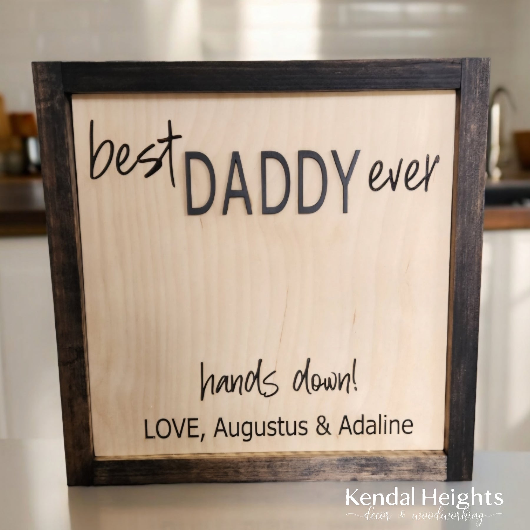 Featured in 12x12" with natural laser, raised Mommy or Daddy lettering, with matching frame in espresso.