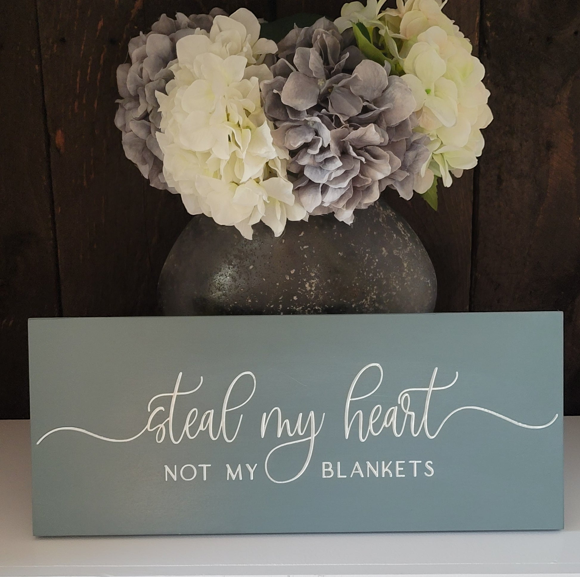 Perfect sign for an addition to your bedroom. This cute 17x7" sign is featured in blue pine paint. Can also customize to an over sized sign to hang over your bed.