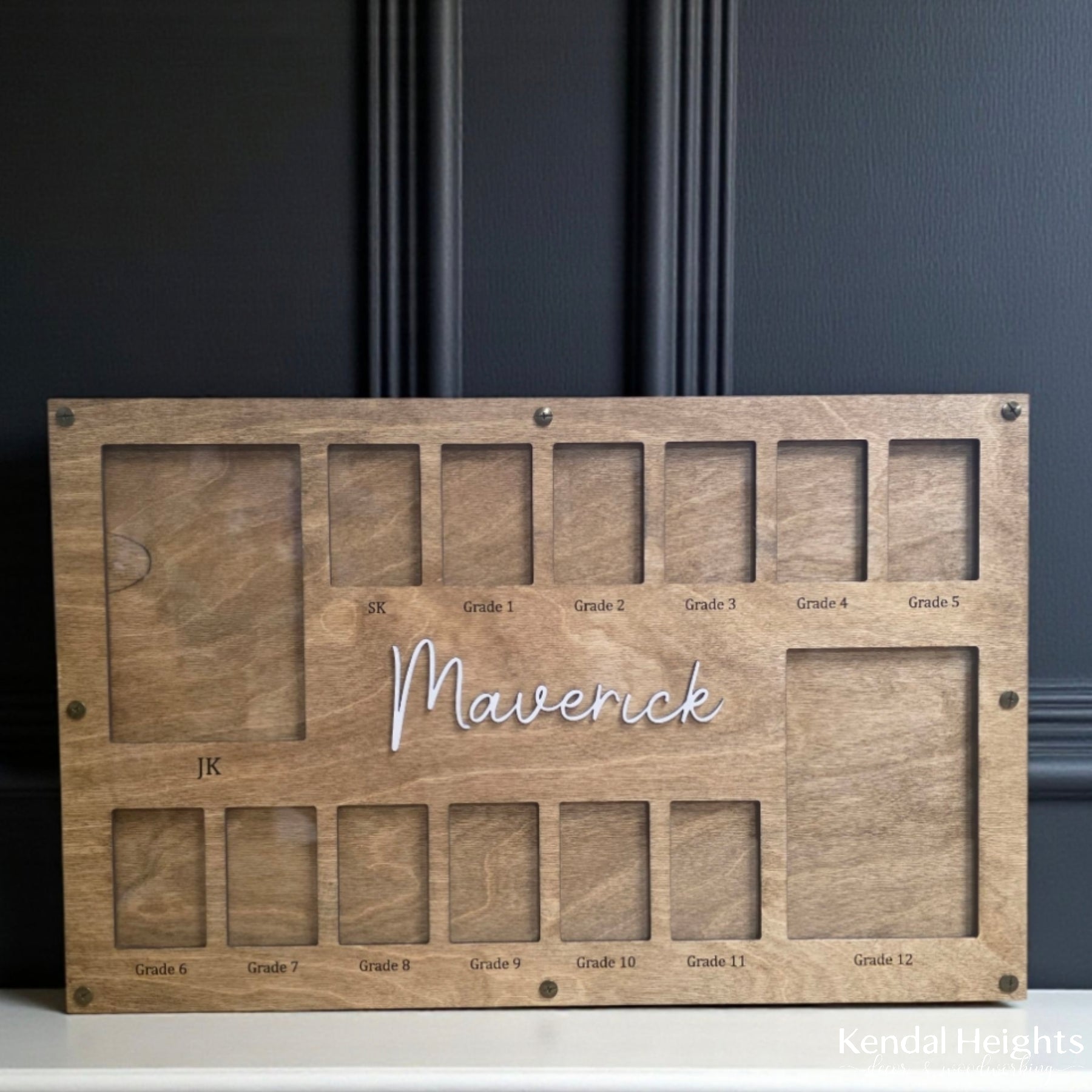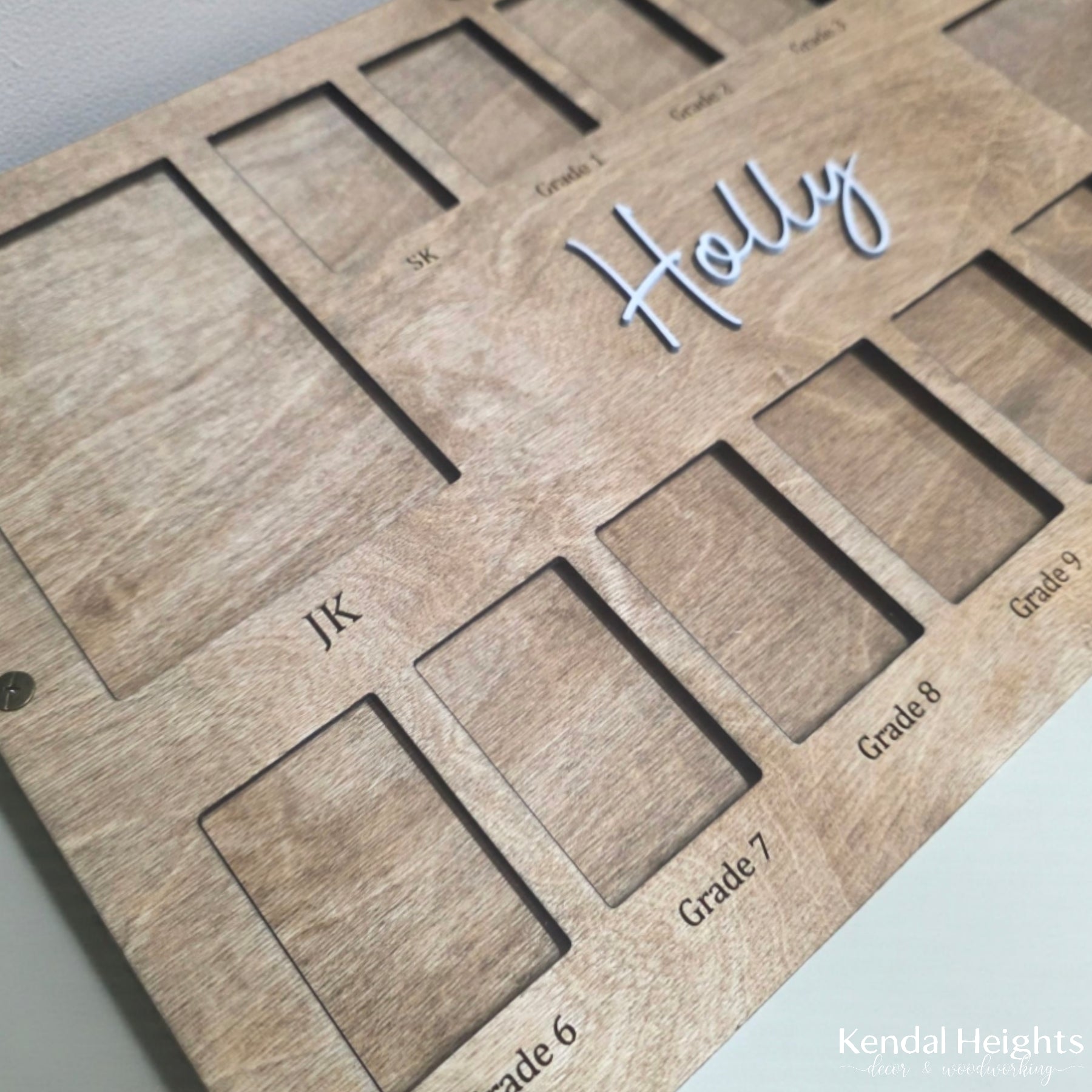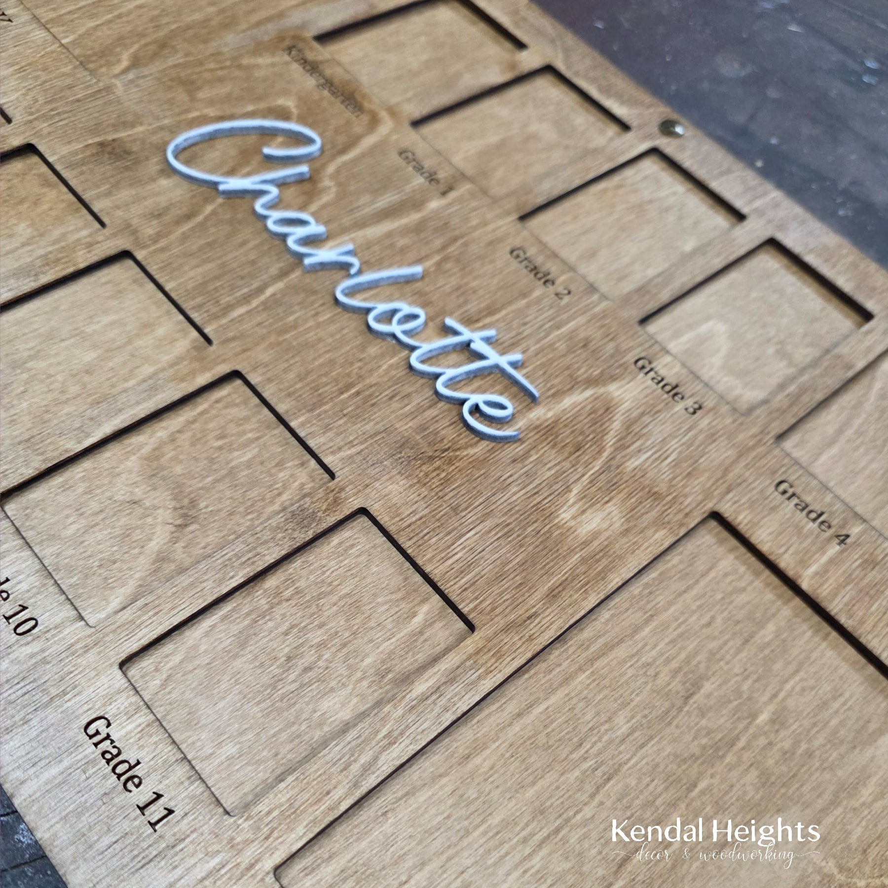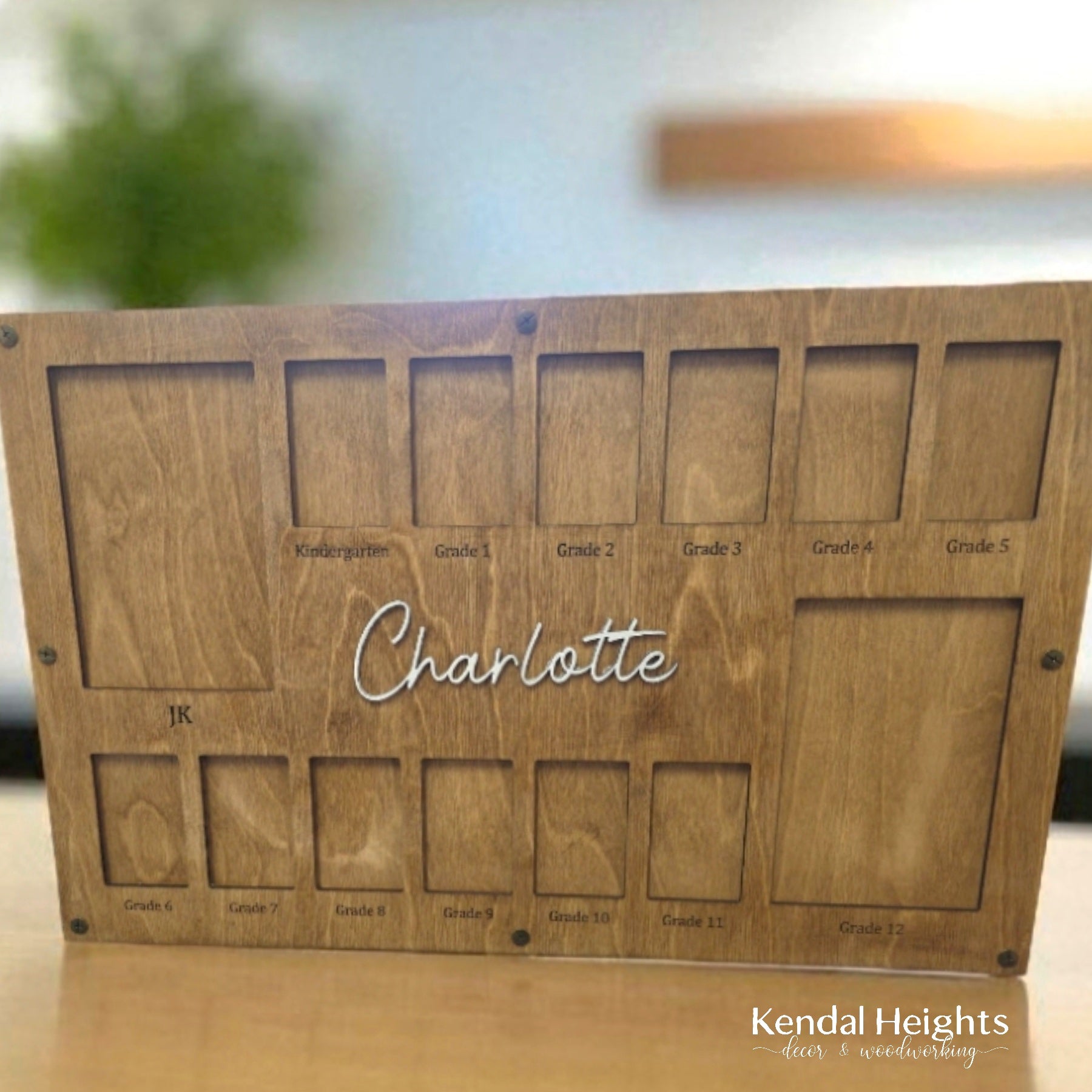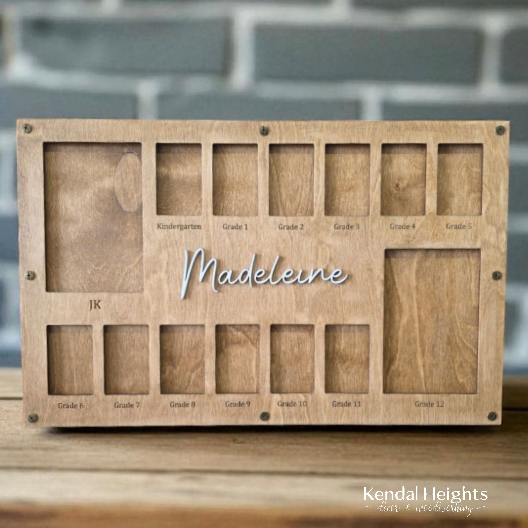 Custom yearly photo frame starting from JK to Grade 12. Unscrew the little rivets and add your photo. Works best with a little tape or glue on the back of the photo.