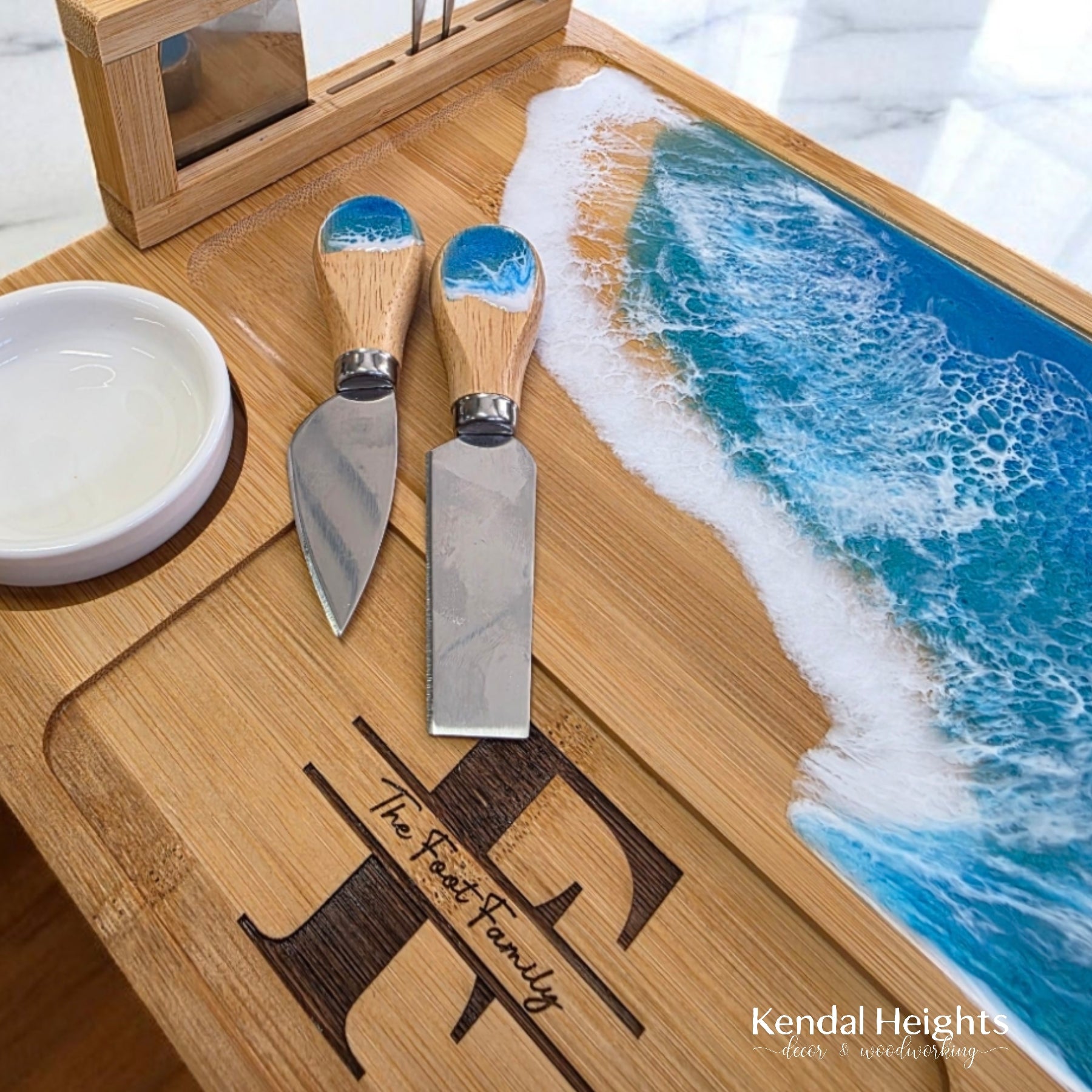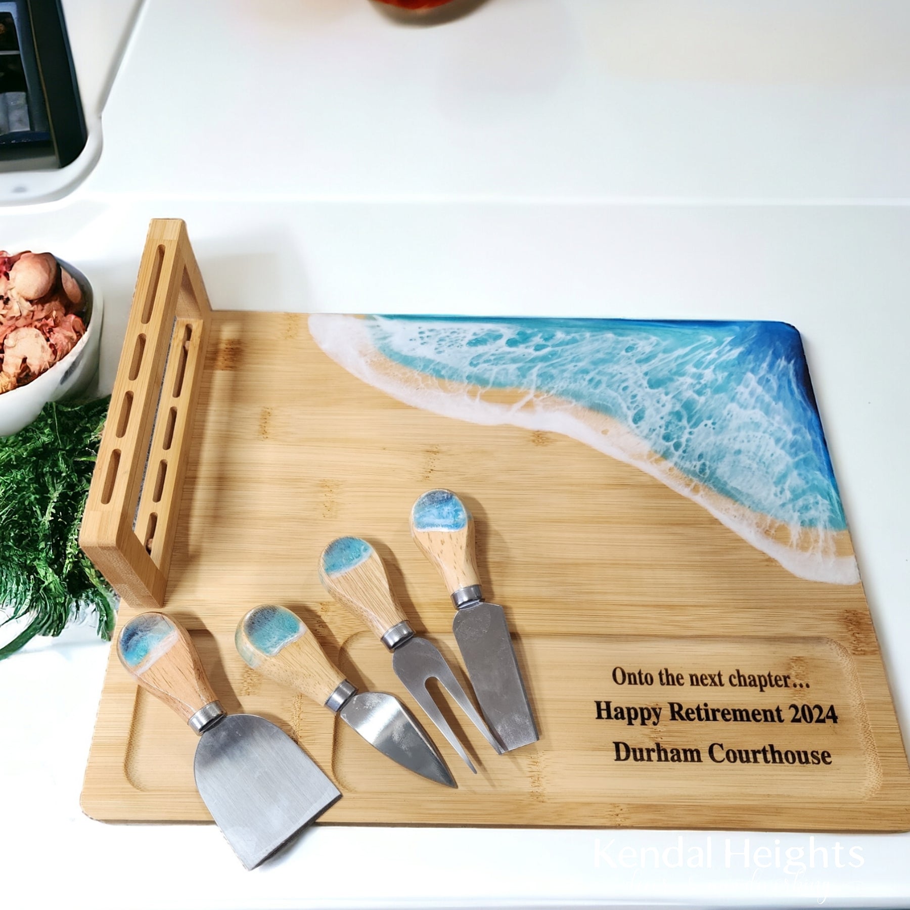 14” L X 11” W. Includes 4 knife set with beach theme epoxy.