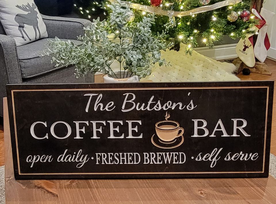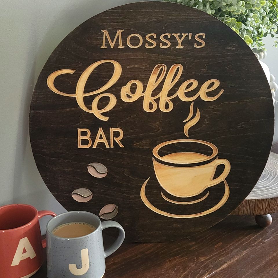 Rustic beautiful coffee bar signs would look great hanging over your own coffee bar station. Feature a Kendal Heights coffee bar sign personalized with your name.