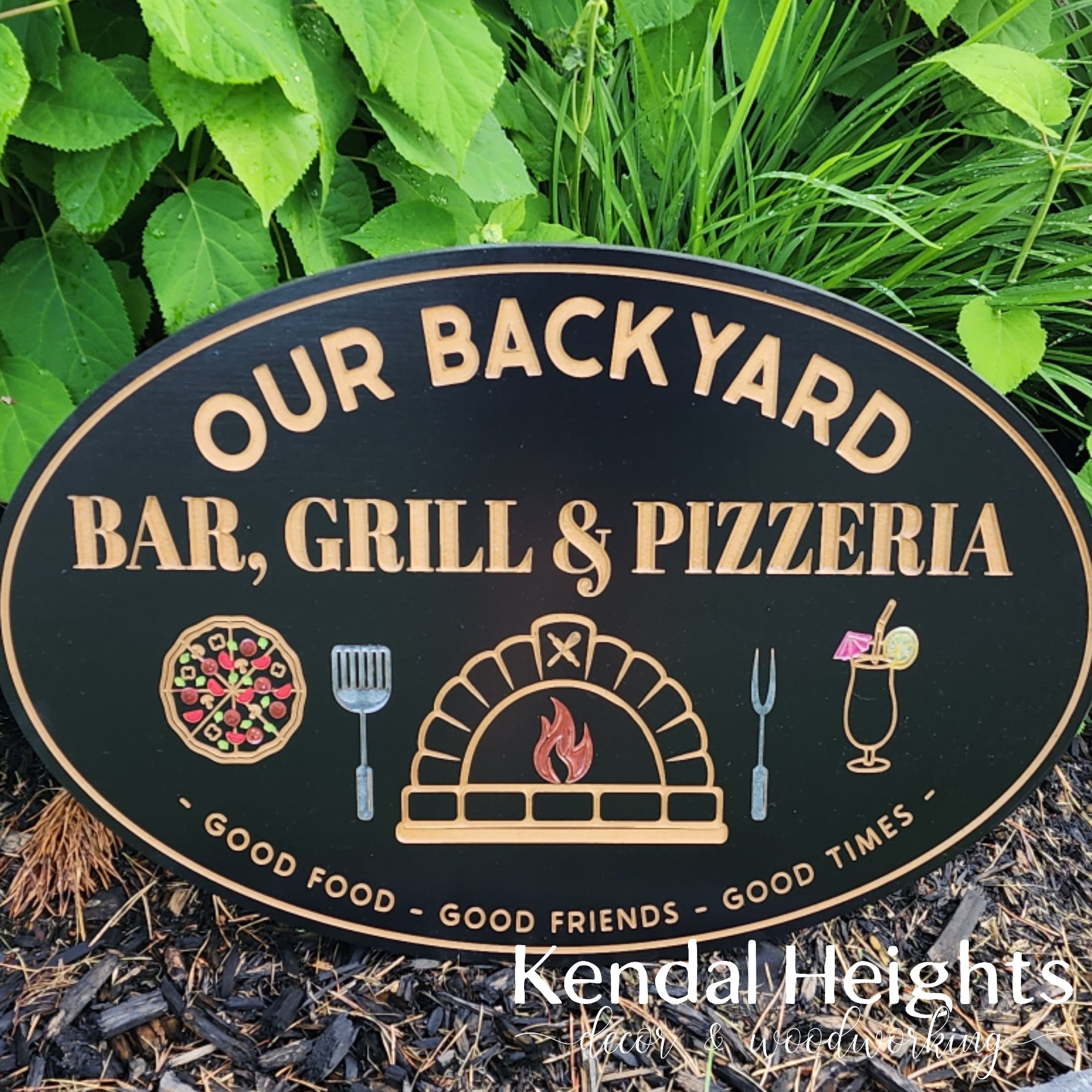 Sit back in your backyard with a custom bar & pizza sign from Kendal Heights Décor and Woodworking!
