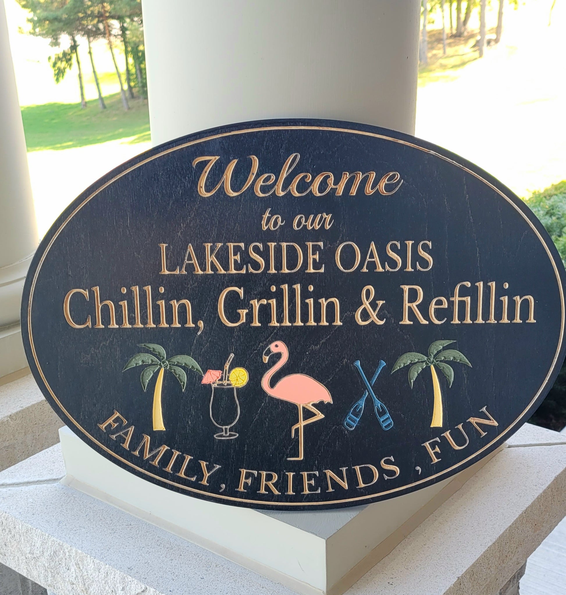 Choose from Lakeside Oasis with the flamingo and symbols or choose with your family name and drinks.