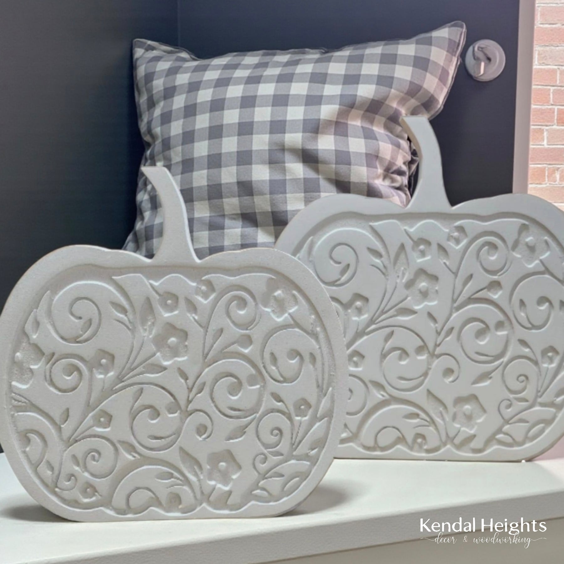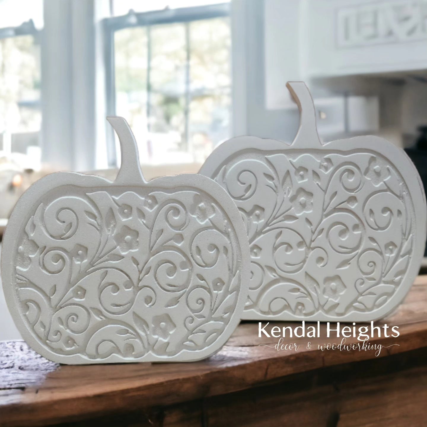 Floral pattern  engraved into a self standing pumpkin, then painted in our ash colour. Gives a warmth and depth which is a great addition to your fall decor.