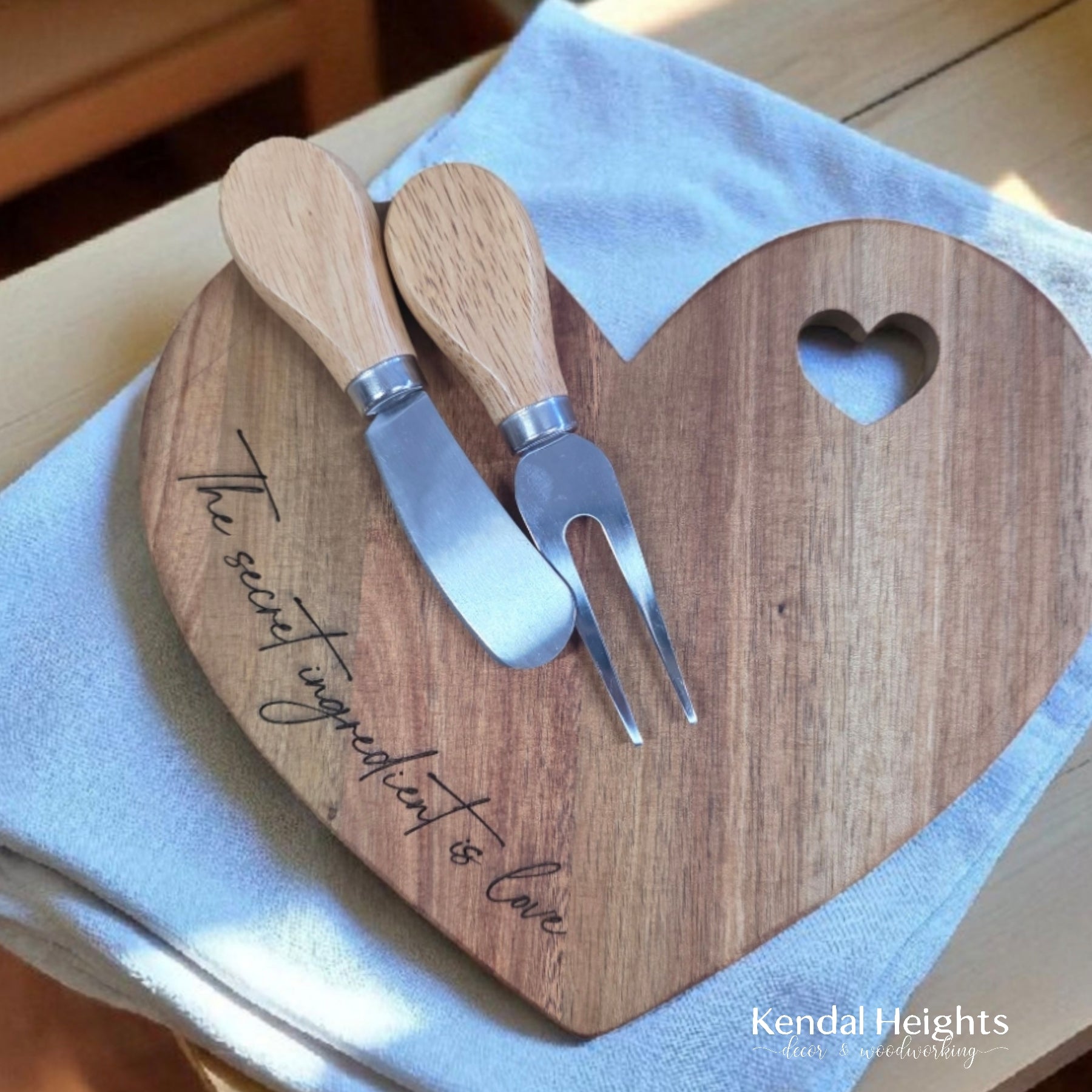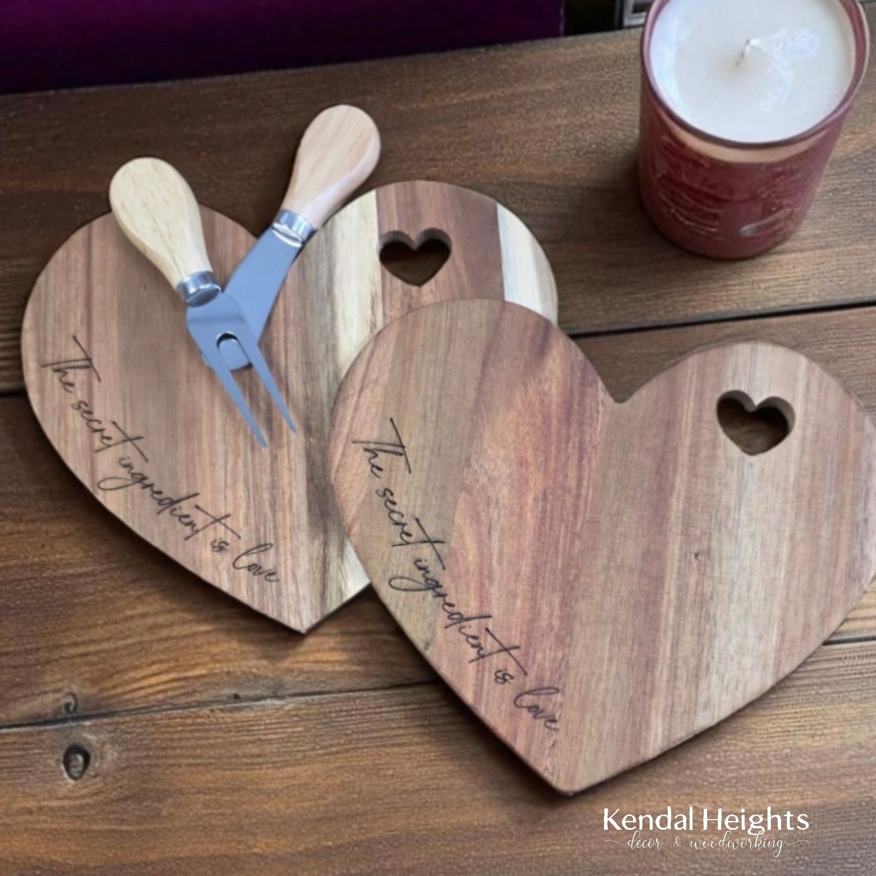 Beautiful personal sized acacia cutting board. 8x7" heart with knife & fork.