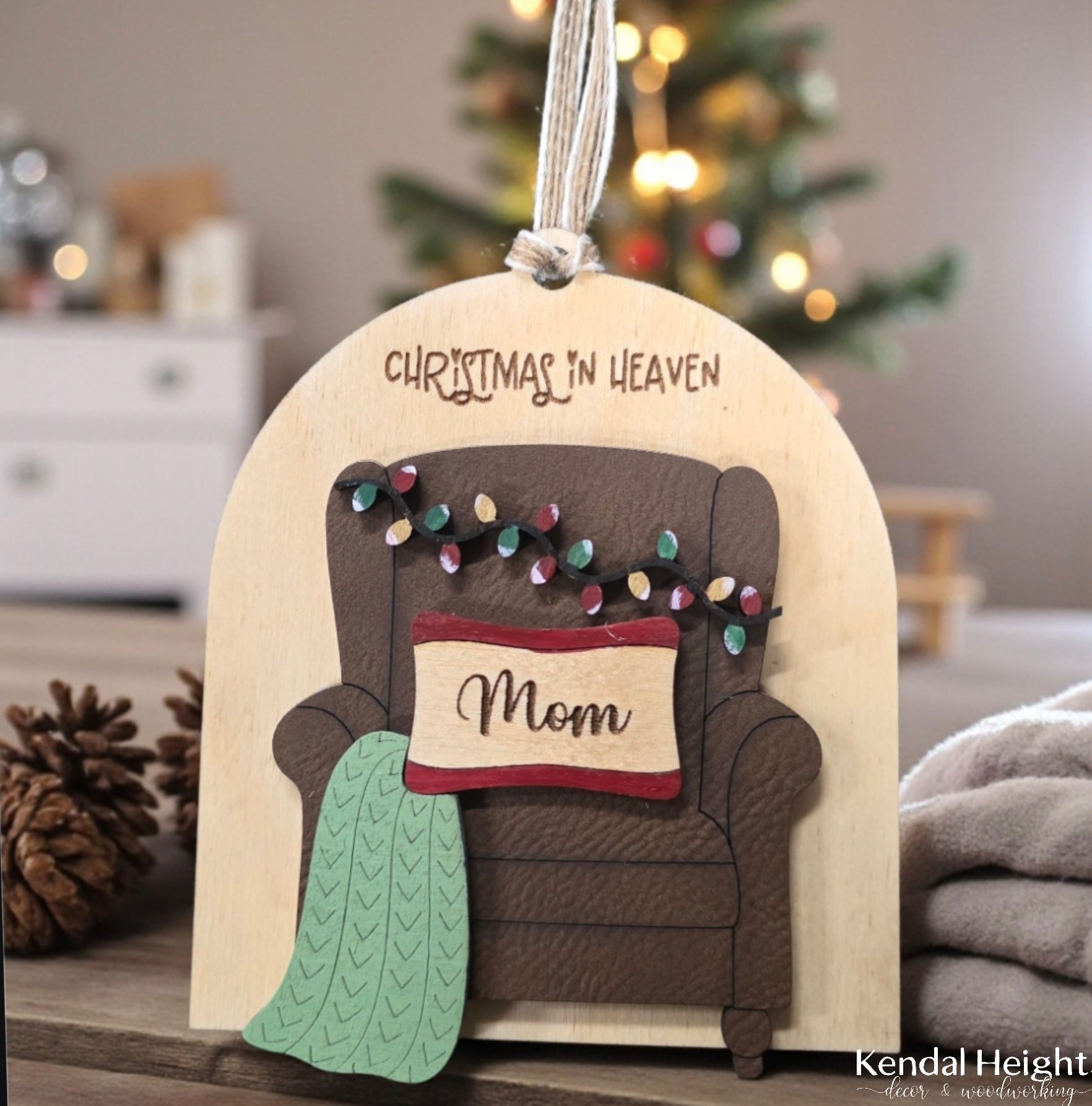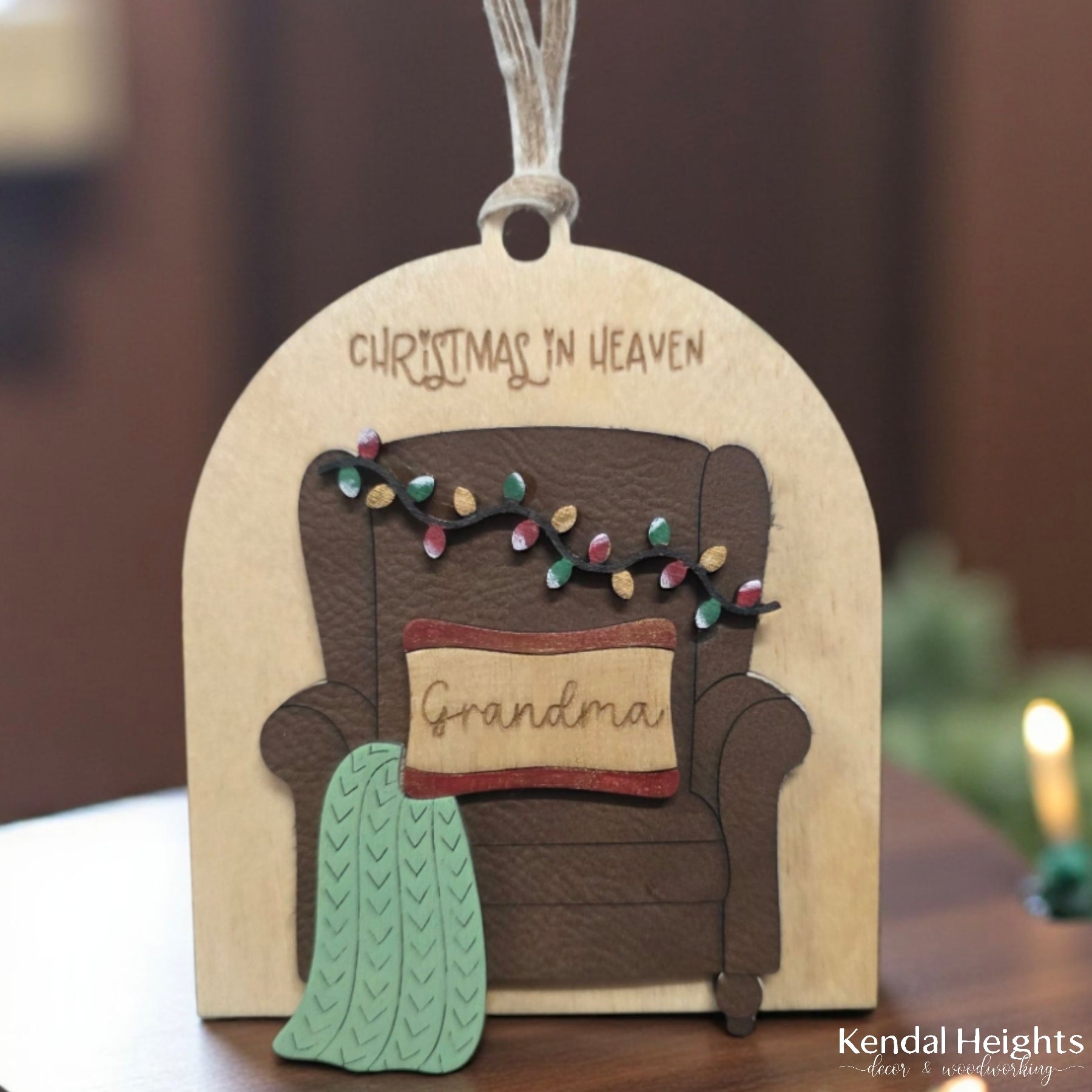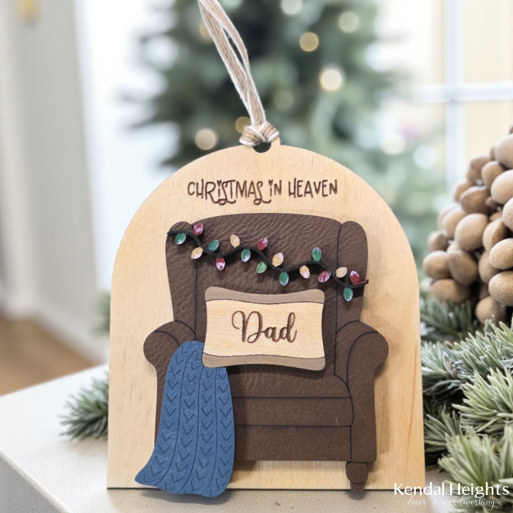 Beautiful memorial ornament customized with any name and features leather on the chair.