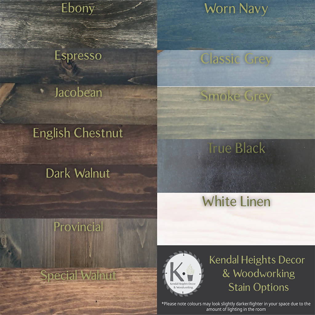 At the time of ordering we will confirm your dimensions and stain colour. Once we start production of your item, we can not make any changes. Please be sure you measurements are correct and take the time you need to choose your stain.