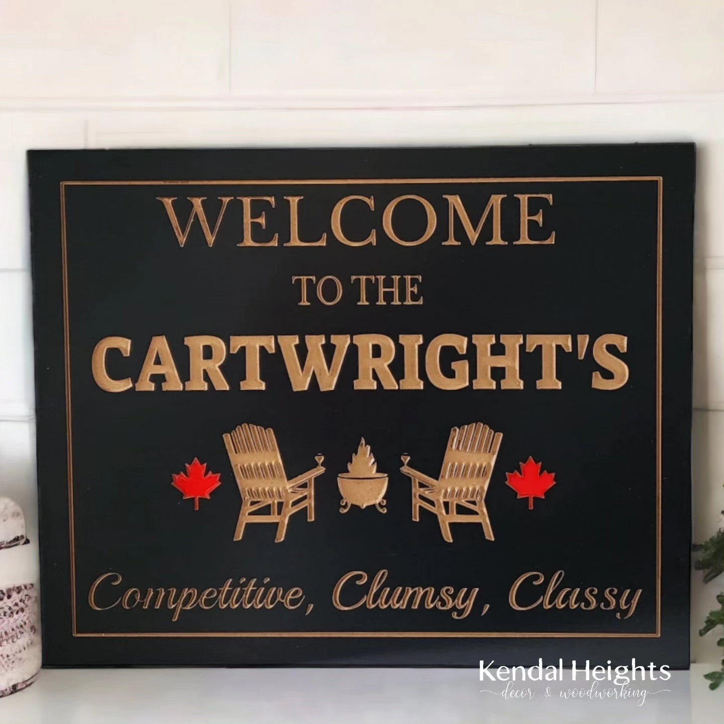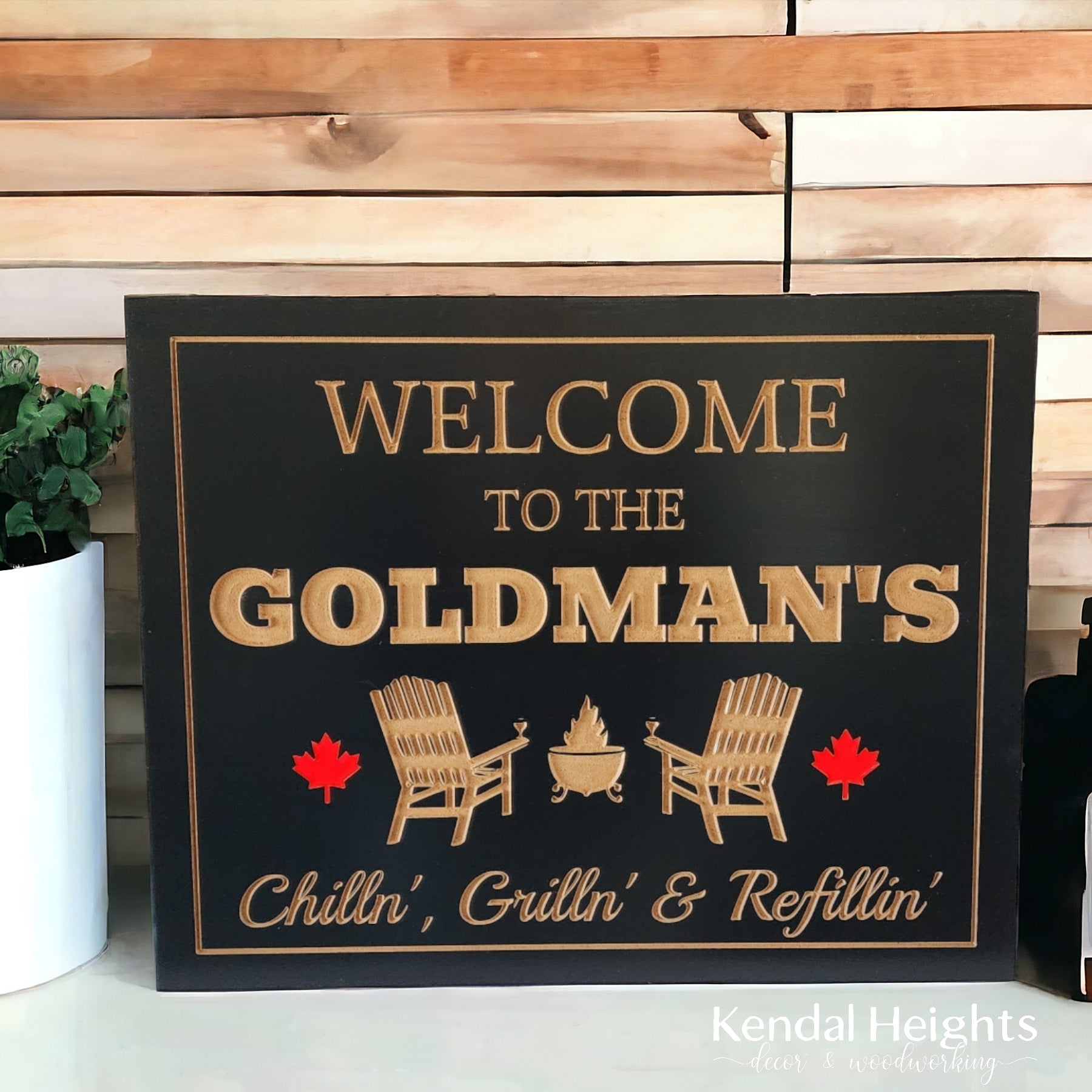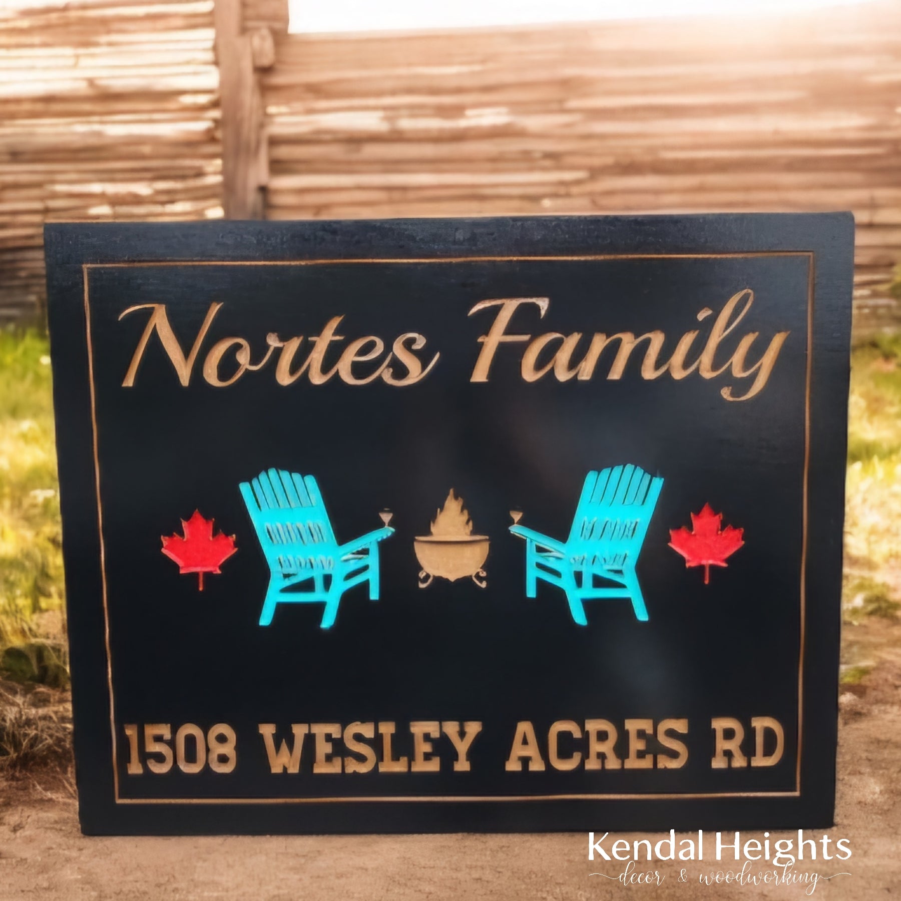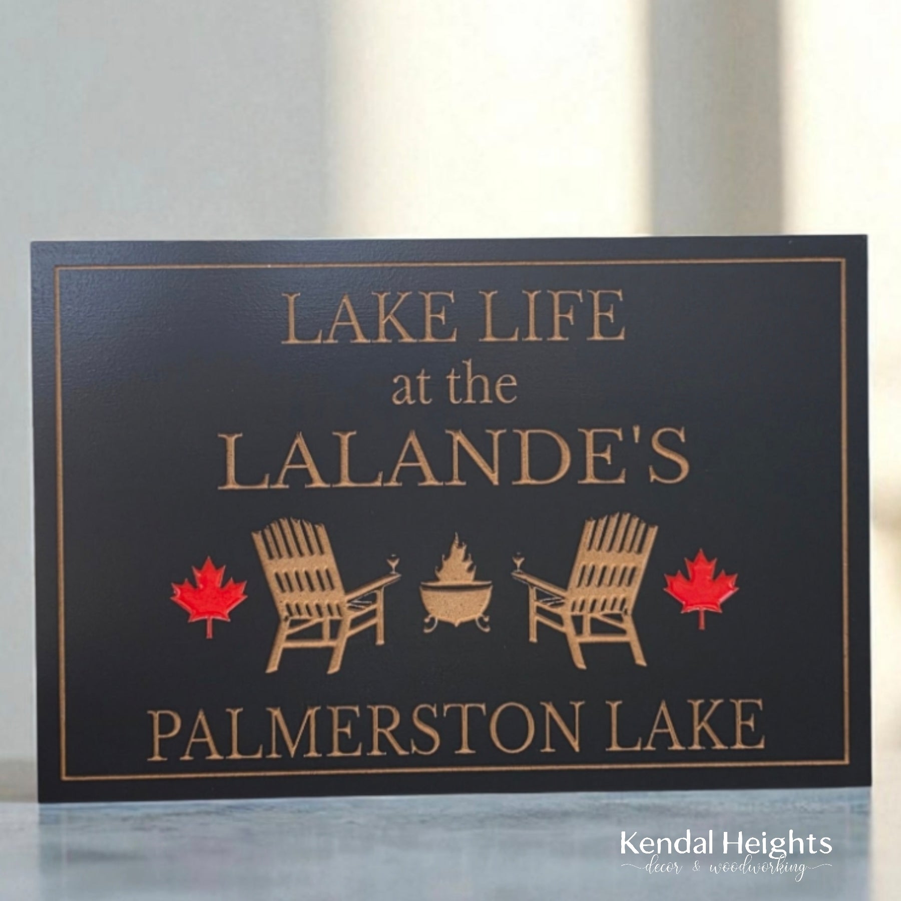 Enjoy your cottage or camping trailer with a new sign to remind you of the outdoors. Featuring your family name with campfire and chairs and 2 maple leafs with red epoxy.