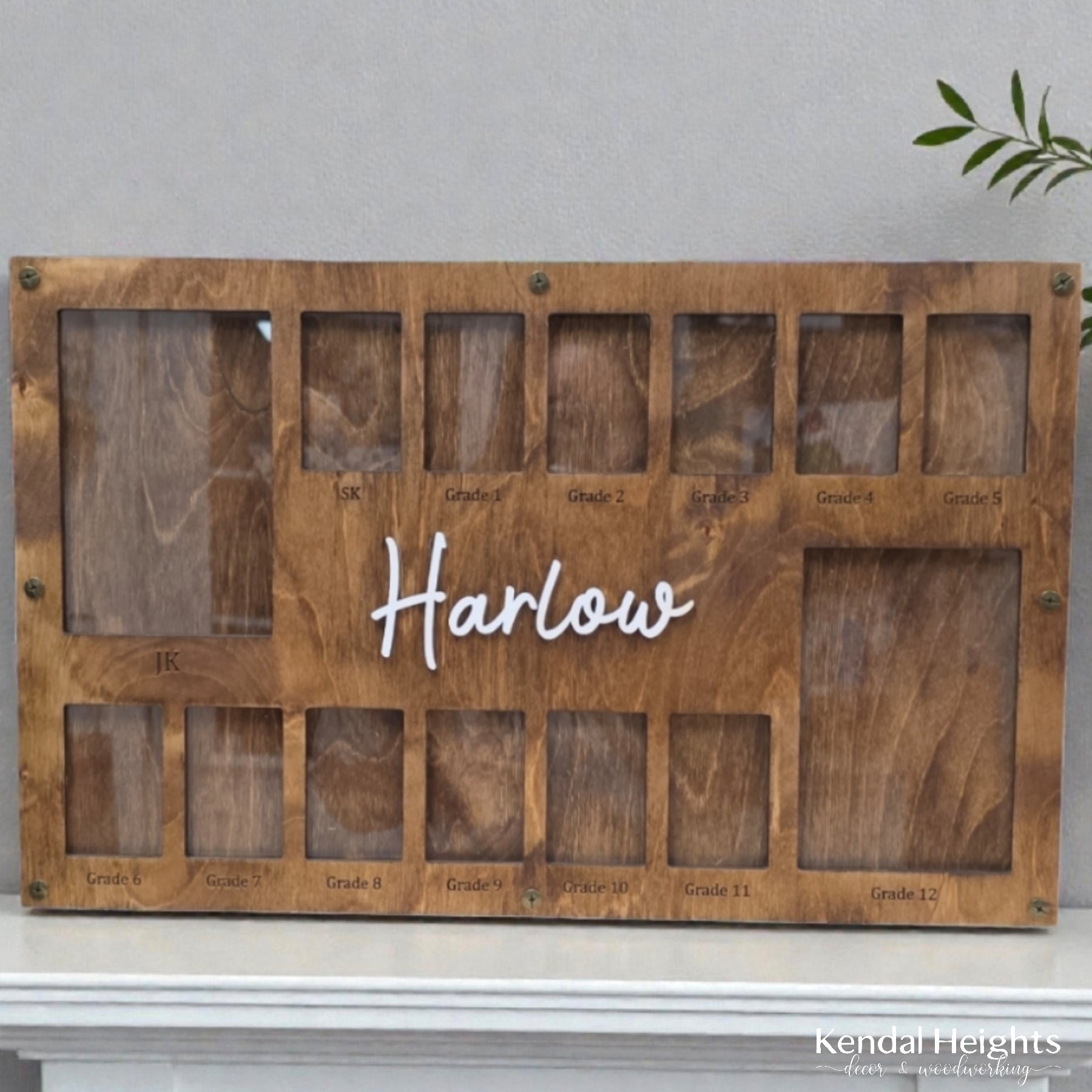 Custom yearly photo frame starting from JK to Grade 12. Unscrew the little rivets and add your photo. Works best with a little tape or glue on the back of the photo.